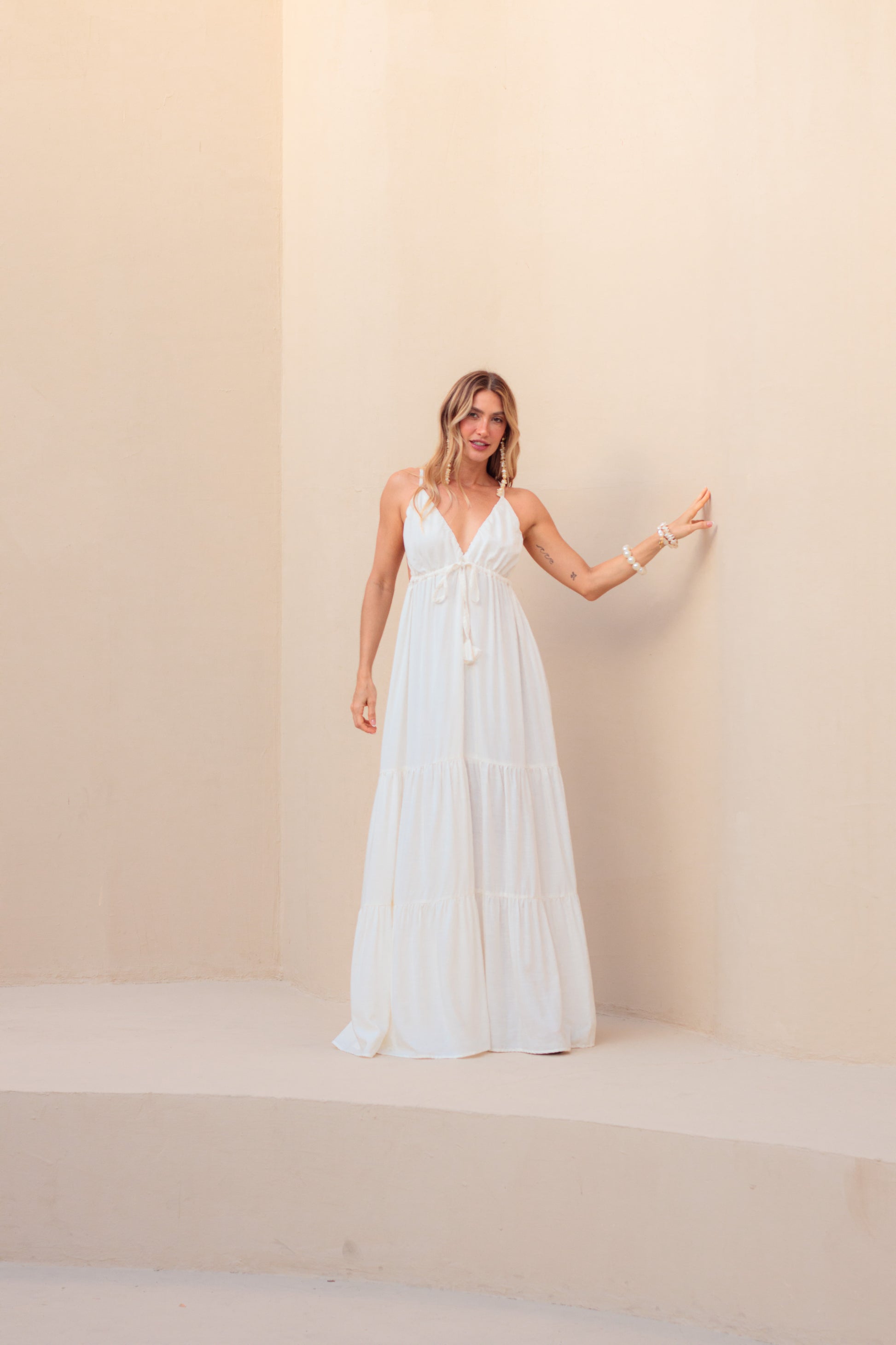 Vestido Nicole possui babados fluidos com regulagem nas alças e viés no busto com ajuste frontal para amarração.