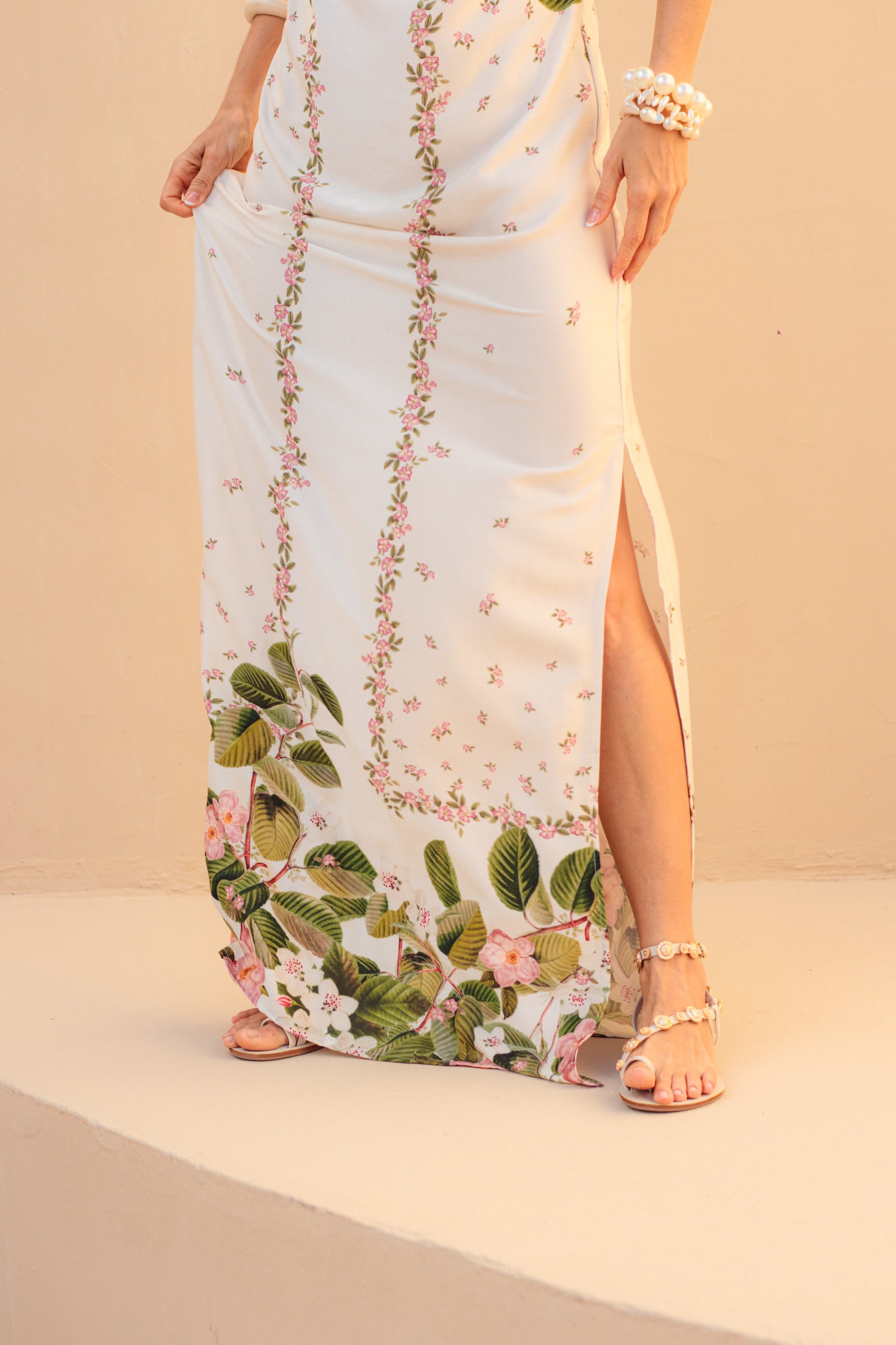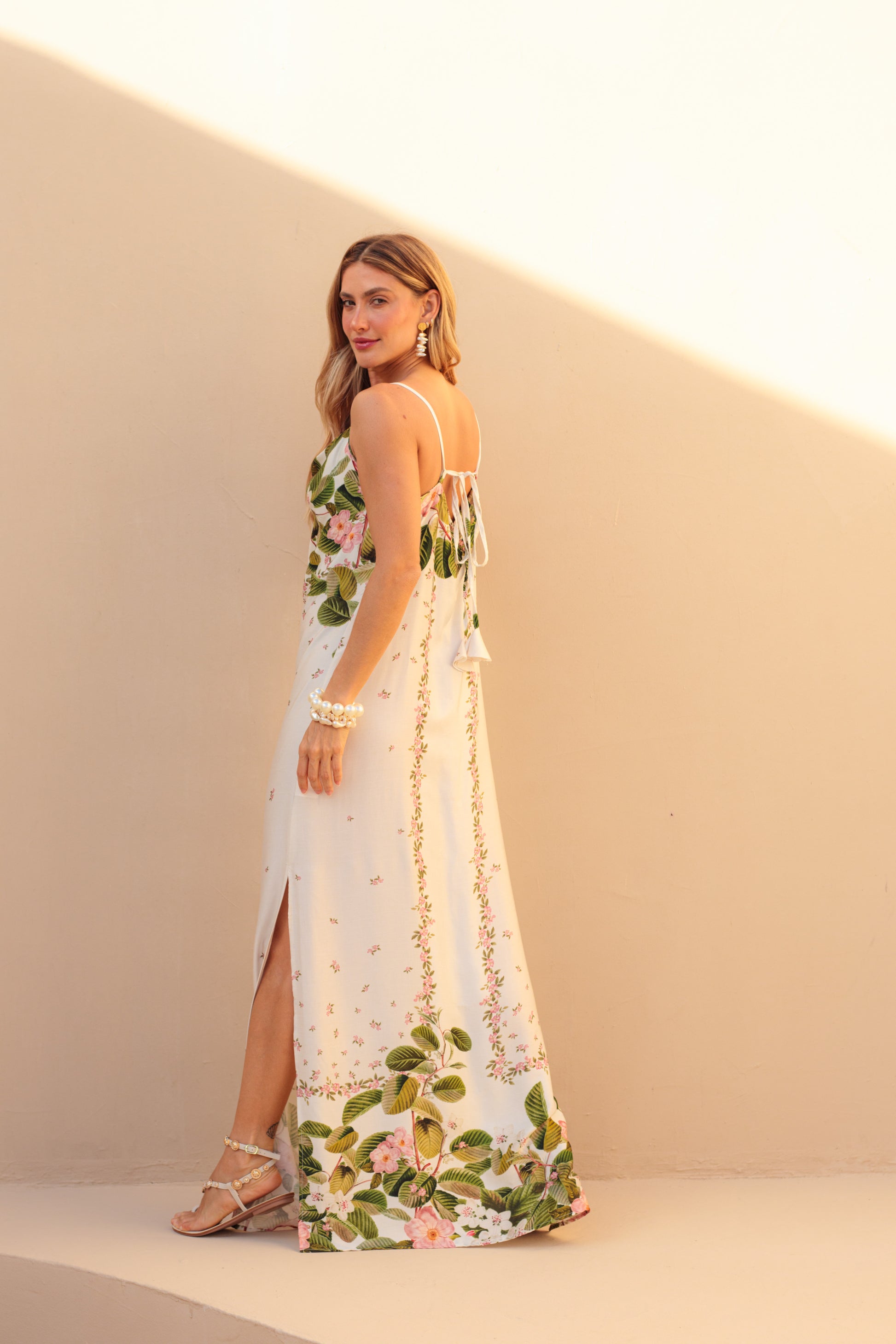 Vestido Rio com drapeado no busto e nas costas. Possui regulagem nas alças e fendas laterias.